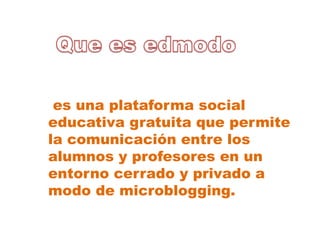 Edmodo es una plataforma educativa gratuita que permite la comunicación privada entre estudiantes y profesores a través de mensajes y archivos compartidos. Puede usarse para enviar tareas, reforzar contenidos de clase con material en línea, y proporciona una alternativa segura para la comunicación. Es fácil de usar aunque carece de algunas utilidades como ver todos los mensajes de un miembro o organizar archivos enviados.