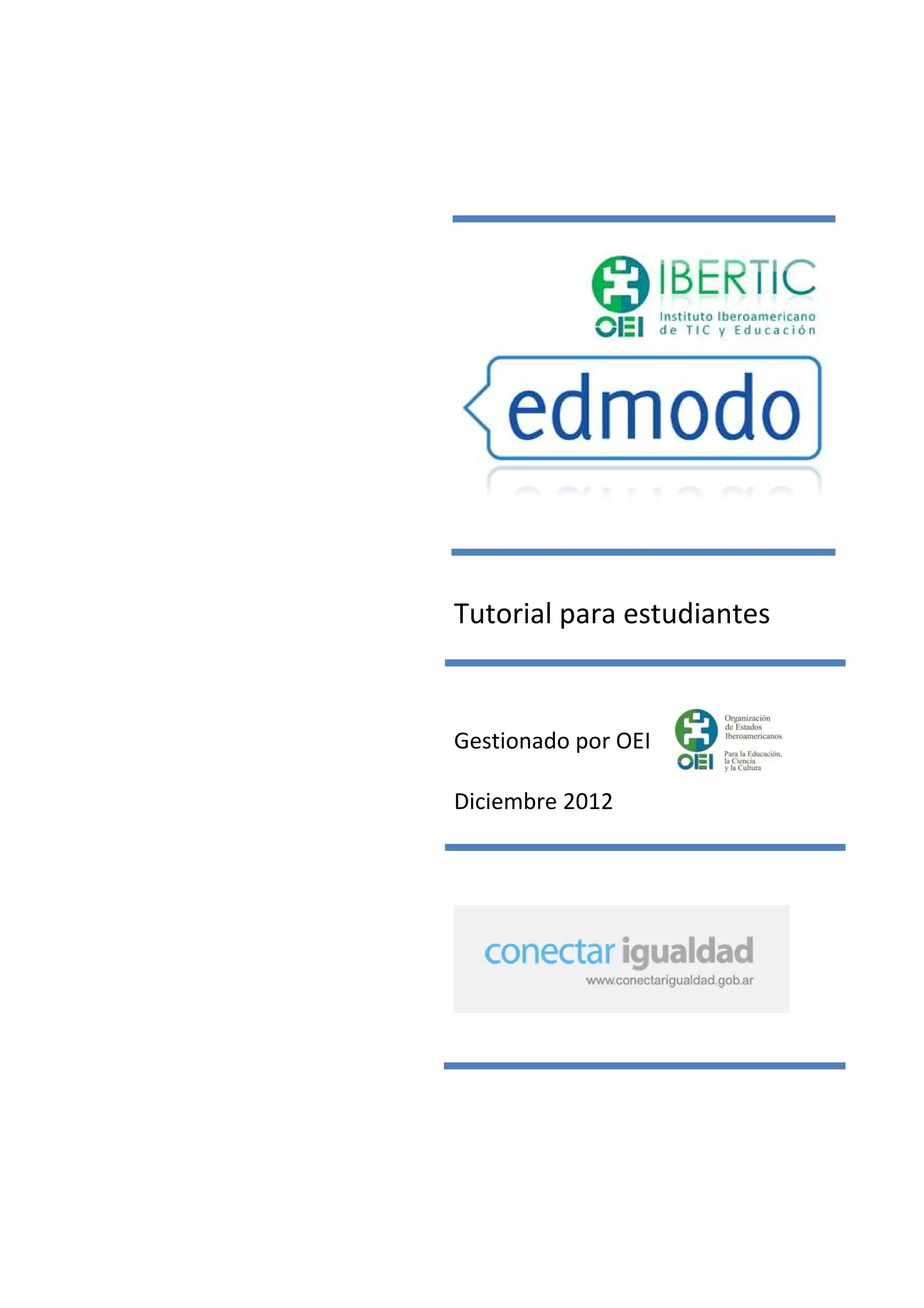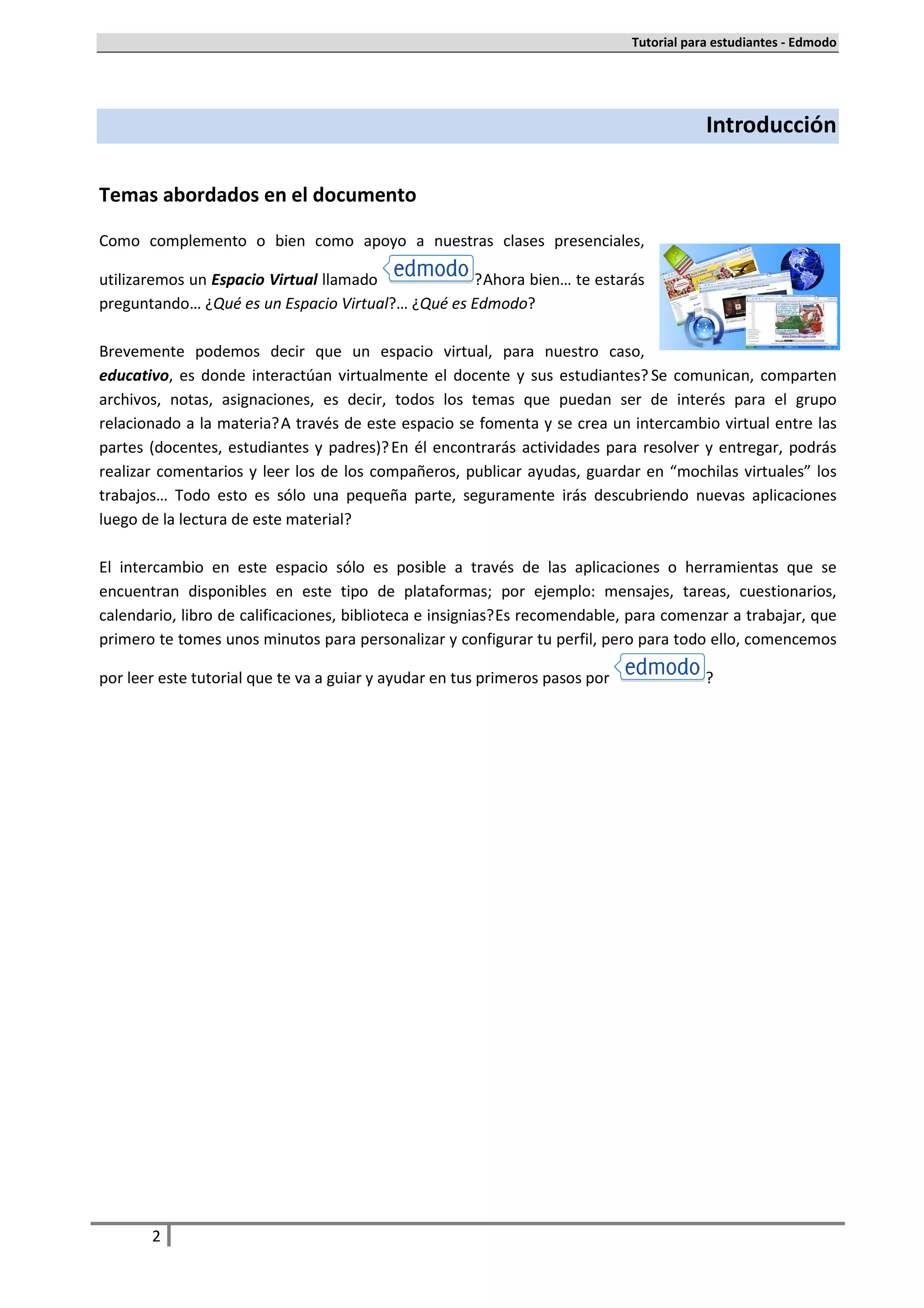 Este documento presenta un tutorial para que estudiantes aprendan a usar la plataforma virtual Edmodo. Explica cómo registrarse e identificarse como estudiante, actualizar el perfil, y navegar las secciones como el muro, biblioteca, calendario, asignaciones, medallas y código para padres. El objetivo es guiar a los estudiantes en sus primeros pasos usando Edmodo para la educación virtual.