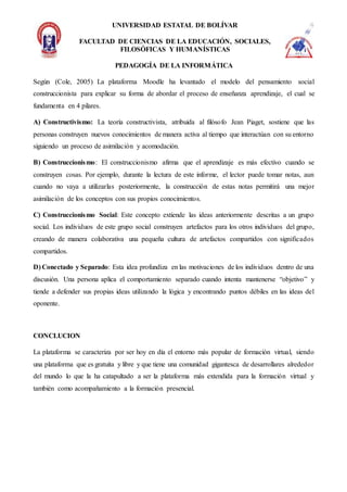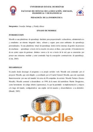 Moodle y Edmodo son plataformas de aprendizaje virtual. Moodle es un sistema de gestión de aprendizaje desarrollado como código abierto, mientras que Edmodo es una red social privada para el entorno educativo. Ambas se basan en enfoques constructivistas y permiten a educadores crear cursos y compartir recursos con estudiantes de manera online.