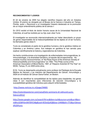 Edmond J. Yunis Turbay es un genetista colombiano nacido en 1929 que se graduó de la Universidad Nacional de Colombia en 1954 y ha desarrollado una extensa carrera en investigación genética en universidades en los Estados Unidos. Es reconocido internacionalmente por haber descubierto un grupo de genes responsables de la histocompatibilidad de los tejidos humanos y es considerado el padre de la genética humana y médica en Colombia y América Latina.