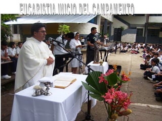 El documento describe las actividades de un campamento pedagógico. Incluye una eucaristía para iniciar el campamento, trabajos artísticos de los ciclos, una presentación teatral de los ciclos y la participación de estudiantes de primaria y secundaria.