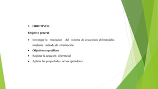 El documento presenta el método para resolver sistemas de ecuaciones diferenciales lineales mediante el uso del operador diferencial. Se define el operador diferencial y cómo puede expresarse un sistema de ecuaciones diferenciales en términos de este operador. Luego, se aplica el método de eliminación para reducir el sistema a una sola ecuación diferencial de orden superior con coeficientes constantes. Finalmente, se resuelve un ejemplo numérico para ilustrar los pasos del método.