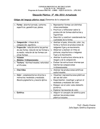 Este documento presenta los códigos del lenguaje plástico visual y elementos de la composición que serán estudiados en la asignatura de Educación Plástica de 3er año en 2012. Incluye conceptos como forma, composición, proporción, volumen, textura, color, cine/video y estética. Para cada elemento se enumeran objetivos como analizar formas abstractas y figurativas, observar el ritmo y equilibrio en imágenes, experimentar con el modelado y mezcla del color, y adquirir herramientas para