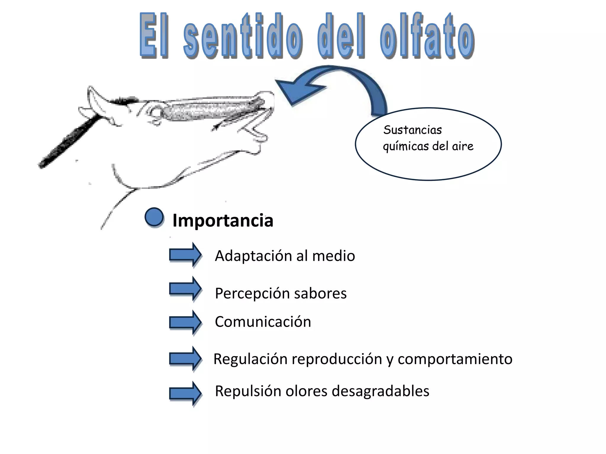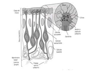 El documento describe el sistema olfativo y su importancia para la adaptación al medio, percepción de sabores y comunicación. Existen dos tipos de sistemas olfativos: el principal, compuesto por la membrana olfatoria y el bulbo olfatorio, y el accesorio, que detecta feromonas. Ambos sistemas transmiten la información olfativa al cerebro para regular comportamientos como la reproducción.