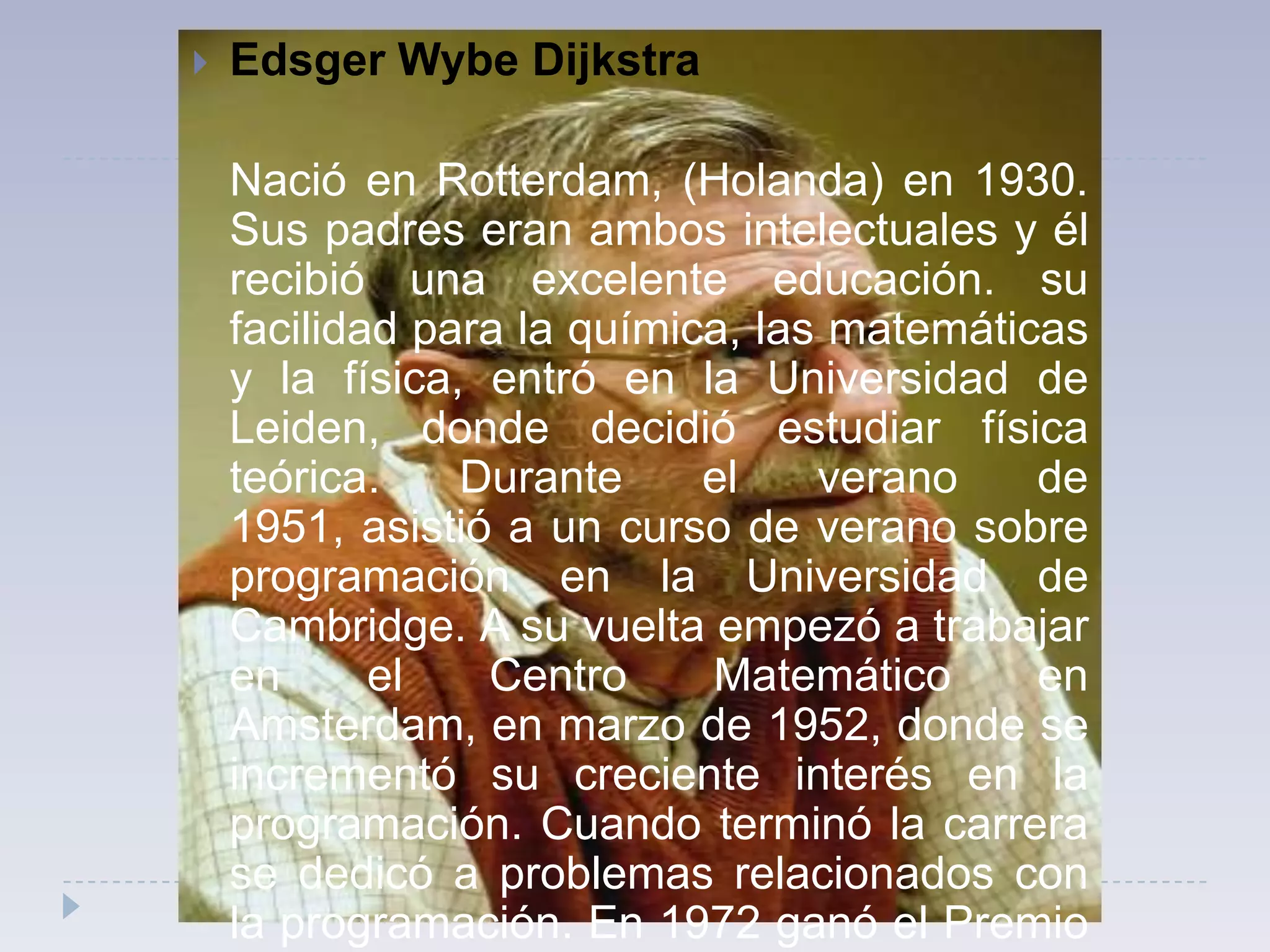 Edsger Wybe Dijkstra fue un científico de computación holandés nacido en 1930 que desarrolló el algoritmo de Dijkstra para encontrar la ruta más corta en un grafo. En 1956, anunció su algoritmo de caminos mínimos después de trabajar con un ordenador en el Centro Matemático de Ámsterdam. A principios de los años 60, aplicó la idea de exclusión mutua a las comunicaciones entre una computadora y su teclado.