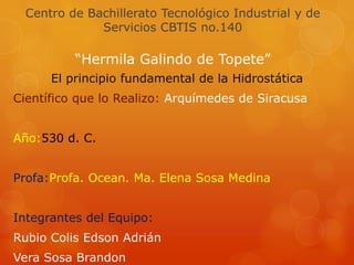 Este documento describe el trabajo del científico griego Arquímedes en hidrostática. Explica cómo Arquímedes descubrió el principio de flotación y cómo lo usó para determinar si la corona de un rey estaba hecha de oro puro. También cubre otros logros matemáticos y de ingeniería de Arquímedes y las circunstancias de su muerte.