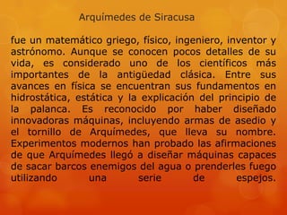 Este documento describe el trabajo del científico griego Arquímedes en el siglo III a. C. Explica cómo Arquímedes descubrió el principio de la hidrostática y cómo lo usó para determinar si una corona dorada contenía plata al sumergirla en agua. También cubre algunos de los otros logros matemáticos y de ingeniería de Arquímedes.
