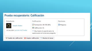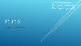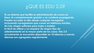 El documento proporciona una introducción al sistema Edu 2.0, un sistema gratuito para administrar cursos en línea. Explica cómo los profesores pueden crear clases, lecciones, exámenes, tareas y grupos de estudiantes, y comunicarse con los estudiantes a través de correo y foros. El sistema ofrece diversas herramientas para que los estudiantes aprendan de manera colaborativa, incluyendo wikis, blogs y salas de chat.