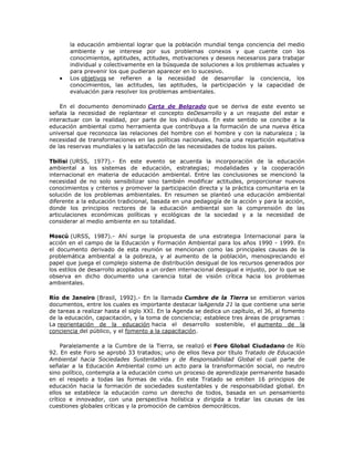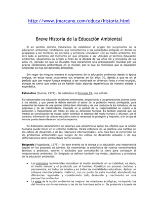 Este documento resume brevemente la historia de la educación ambiental. Comenzó en las sociedades antiguas con una estrecha vinculación entre las personas y su medio ambiente. En la década de 1970 surgió como un campo de estudio a raíz de la creciente preocupación mundial por el deterioro ambiental. Desde entonces, ha habido varias conferencias clave sobre el tema, como las de Estocolmo, Belgrado y Río, que han ayudado a definir los objetivos y principios de la educación ambiental y su importancia para lograr un