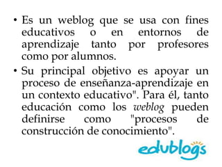 Este documento describe un weblog que se usa con fines educativos para apoyar el proceso de enseñanza y aprendizaje, permitiendo a profesores y estudiantes construir conocimiento de manera colaborativa.