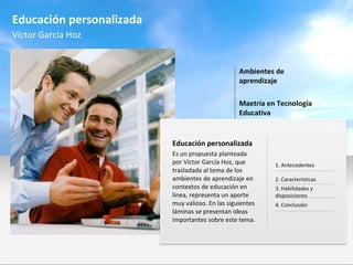 El documento describe la educación personalizada propuesta por Víctor García Hoz y cómo puede aplicarse a ambientes de aprendizaje en línea. La educación personalizada enfatiza la dignidad de cada persona y su protagonismo en su propia formación. Según autores como Ortega y Gasset y Julián y Marías, una educación no puede considerarse personalizada si no aspira a serlo o si diluye a los estudiantes en una masa. El documento luego describe las características de la educación personalizada como la singularidad y apertura de cada persona, así como su aut
