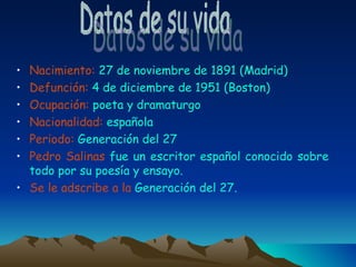 Pedro Salinas fue un poeta y ensayista español perteneciente a la Generación del 27. Dividió su carrera poética en tres etapas: la inicial marcada por la influencia de Juan Ramón Jiménez, la de plenitud definida por su trilogía amorosa inspirada en un amor verdadero, y la del exilio en Puerto Rico. Sus poemas se caracterizaron por temas del amor, la pasión y la pérdida tratados a través de métricas variadas como el heptasílabo, octosílabo y