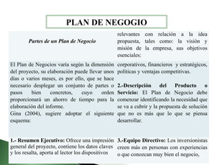Un plan de negocio típicamente contiene 10 partes clave: (1) Resumen ejecutivo, (2) Descripción del producto o servicio, (3) Equipo directivo, (4) Análisis de mercado, (5) Plan de marketing, (6) Sistema de negocio, (7) Cronograma, (8) Análisis FODA, (9) Financiamiento, y (10) Conclusiones. Siguiendo este formato ordenado ayuda a crear un plan de negocio completo y efectivo.