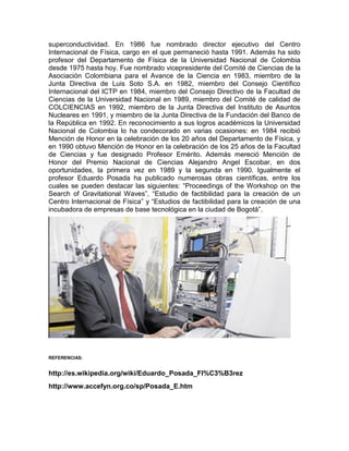 Eduardo Posada Flórez es un físico y científico colombiano nacido en 1942 que es conocido como el padre de las políticas de ciencia, tecnología e innovación en Colombia. Se desempeñó como director ejecutivo del Centro Internacional de Física y ha sido profesor de la Universidad Nacional de Colombia. Ha realizado importantes contribuciones en el campo de la superconductividad y la criogénesis.
