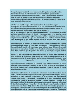 Eduardo Posada Flórez es un físico y científico colombiano nacido en 1942 reconocido como el padre de las políticas de ciencia y tecnología en Colombia. Ha realizado importantes contribuciones en el campo de la física de bajas temperaturas y la superconductividad. También desempeñó un papel clave en la formulación de leyes y políticas científicas en Colombia, incluida la Ley de Ciencia y Tecnología de 1990. Actualmente es presidente de varias organizaciones científicas en Colombia.