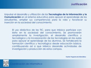 Este documento describe un plan para implementar el uso de Edublogs en una escuela preparatoria con el objetivo de apoyar el aprendizaje de los estudiantes y promover la interacción entre profesores y estudiantes. El plan incluye capacitar a los profesores sobre el uso de Edublogs, crear Edublogs para cada materia para compartir recursos educativos, y alentar a los estudiantes a participar en la creación de contenidos para los Edublogs.