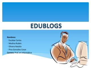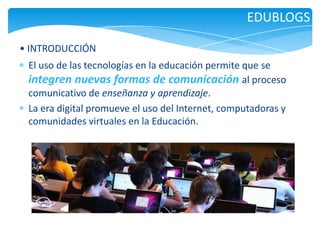 El documento habla sobre los edublogs. Explica que un edublog es un blog que se utiliza con fines educativos por profesores e instituciones educativas. Detalla los beneficios de los edublogs para profesores y alumnos, como la integración de tecnología y el desarrollo del pensamiento crítico. Además, indica que la creación de un edublog es sencilla a través de plataformas como Blogger o WordPress, y menciona diferentes tipos de edublogs, como individuales y colectivos.