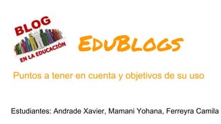 EduBlogs son blogs educativos que tienen como objetivo principal apoyar el proceso de enseñanza y aprendizaje en un contexto educativo. Los EduBlogs ofrecen varios beneficios como servir como un canal de comunicación informal entre profesores y estudiantes, fomentar la interacción social y permitir que los estudiantes experimenten y construyan su propio aprendizaje de manera personal. Para sacar el máximo provecho de los EduBlogs, se requiere capacitar a estudiantes y profesores en el uso responsable de los recursos de Internet y en