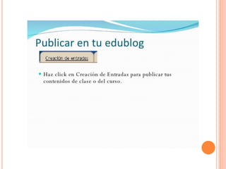 Este documento describe las características y funciones de los edublogs, que son blogs educativos utilizados en centros escolares. Explica que los edublogs permiten compartir experiencias y conocimientos de forma motivante y ayudan a potenciar el análisis y la reflexión. También clasifica los edublogs según su autor, características y funcionalidad, e indica que ofrecen funciones como publicación cronológica, herramientas web 2.0 y aprendizaje colaborativo o autónomo de forma fácil, gratuita