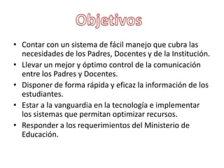 El documento describe un portal educativo desarrollado en Ecuador con software libre que ganó un concurso internacional en 2011. El sistema permite la gestión y administración de sistemas escolares a través de un portal amigable y multiusuario que facilita la comunicación entre padres, docentes e instituciones educativas.