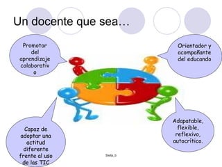 El documento describe cómo el aprendizaje colaborativo basado en TIC no requiere alfabetización tecnológica avanzada, y cómo herramientas web como blogs, wikis y repositorios pueden apoyar la comunicación, escritura colectiva y el intercambio de objetos de aprendizaje, mientras que un docente efectivo promueve el aprendizaje colaborativo, adopta una nueva actitud hacia las TIC, orienta a los estudiantes y se adapta de manera flexible y reflexiva.