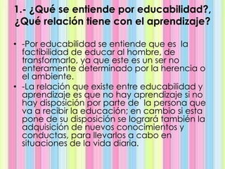 Este documento discute las bases psicológicas del aprendizaje y la educabilidad. Explica que la educabilidad es la capacidad de educar al hombre y transformarlo mediante la influencia del ambiente y la escuela. Discuten las hipótesis sobre el fracaso escolar masivo, incluyendo factores del estudiante, familiares/sociales y de la relación estudiante-escuela. Finalmente, destaca que el papel del maestro es guiar a los estudiantes de manera integral para ayudarlos a desarrollarse.