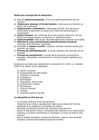 Este documento describe las dimensiones y características fundamentales de la educación. Define la educación como un proceso de perfeccionamiento del ser humano que depende de múltiples factores. La educación es universal, compleja y necesaria para satisfacer las necesidades de supervivencia, conocimiento y formación de las personas.