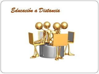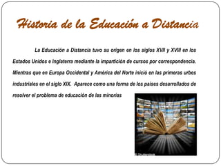 La educación a distancia tuvo sus orígenes en los siglos XVII y XVIII a través de cursos por correspondencia, y se desarrolló en el siglo XIX como una forma de resolver problemas de acceso a la educación. Una de sus características principales es la flexibilidad horaria. Los roles clave en la educación a distancia incluyen coordinador general, experto en contenidos, profesor tutor, diseñador instruccional y evaluador del sistema. Sus principales ventajas son satisfacer demandas educativas y permitir el acceso independientemente de la ubic