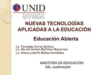Este documento presenta los antecedentes y definición de la educación abierta en México. Detalla que la primera universidad abierta fue creada en el Reino Unido en 1969 y que en México los primeros antecedentes datan de 1947 con la capacitación de maestros a distancia. También describe las características de la educación abierta como dirigirse a adultos, usar metodologías innovadoras y tener un alcance ilimitado, además de definir los roles del profesor y las características del alumno.