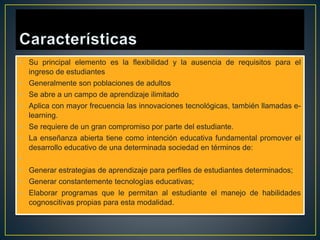 La educación abierta ofrece estudios a adultos en su comunidad mediante una metodología innovadora y curricula diseñada considerando las necesidades de los estudiantes y la sociedad. Se caracteriza por dar mayor autonomía a los estudiantes fuera del aula y aplicar frecuentemente tecnologías como el e-learning. Su objetivo es promover el desarrollo educativo de la sociedad generando estrategias de aprendizaje para diferentes perfiles.