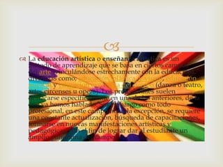 La educación artística se basa en campos del arte como la educación plástica, visual, musical y expresiva. Los profesionales requieren actualizarse constantemente en nuevas manifestaciones artísticas y pedagógicas para brindar un amplio panorama al estudiante. La educación actual se enfoca en cuatro pilares: aprender a conocer, hacer, vivir juntos y ser. Históricamente, el arte se enseñaba en talleres donde los artistas adoptaban aprendices. En la educación superior, las bellas artes designan artes plásticas