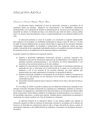 El documento describe la educación básica en México, incluyendo la primaria. Explica que la primaria se cursa en 6 grados y su conclusión es requisito para la secundaria. Ofrece datos estadísticos sobre la matrícula en primaria a nivel nacional y en Veracruz para el ciclo 2012-2013. También describe brevemente la educación normal para maestros y algunos servicios adicionales en las escuelas primarias como actividades relacionadas con la salud y prevención de enfermedades.