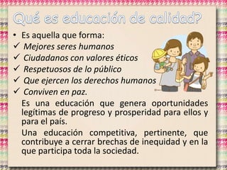 El documento propone mejorar la educación en Colombia para formar mejores ciudadanos con valores éticos mediante una educación de calidad, pertinente e inclusiva que genere oportunidades y cierre brechas de desigualdad. Se busca ampliar la cobertura educativa, especialmente para los niños menores de 5 años, y mejorar los resultados académicos.