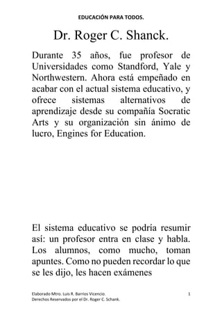 El documento habla sobre la necesidad de reformar el sistema educativo actual. Roger C. Schank, profesor de universidades como Stanford y Yale, ahora se enfoca en acabar con el sistema educativo tradicional y ofrece alternativas de aprendizaje a través de su compañía y organización. El sistema actual se centra demasiado en que los profesores hablen y los estudiantes tomen notas, en lugar de aprender haciendo. La tecnología y el aprendizaje en línea pueden usarse para proporcionar una educación de alta calidad a todos. Se