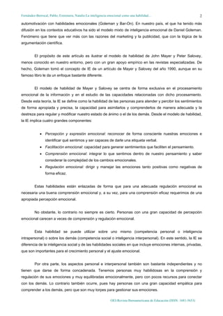 Este documento describe la inteligencia emocional como una habilidad esencial en la escuela. Argumenta que la visión tradicional de la inteligencia basada en el CI ya no es suficiente para el éxito en la vida cotidiana o profesional. En su lugar, propone el modelo de habilidad de inteligencia emocional de Mayer y Salovey, que incluye cuatro componentes: percepción y expresión emocional, facilitación emocional, comprensión emocional y regulación emocional. El objetivo del artículo es sensibilizar a los educ