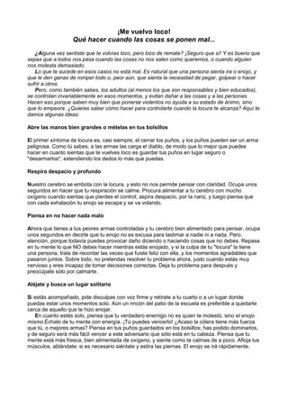 ¡Me vuelvo loco!Quéhacer cuando las cosas se ponen mal... <br /> ¿Alguna vez sentiste que te volvías loco, pero loco de remate? ¡Seguro que sí! Y es bueno que sepas que a todos nos pasa cuando las cosas no nos salen como queremos, o cuando alguien nos molesta demasiado. Lo que te sucede en esos casos no está mal. Es natural que una persona sienta ira o enojo, y que le den ganas de romper todo o, peor aún, que sienta la necesidad de pegar, golpear o hacer sufrir a otros. Pero, como también sabes, los adultos (al menos los que son responsables y bien educados), se controlan invariablemente en esos momentos, y evitan dañar a las cosas y a las personas. Hacen eso porque saben muy bien que ponerse violentos no ayuda a su estado de ánimo, sino que lo empeora. ¿Quieres saber cómo hacer para controlarte cuando la locura te alcanza? Aquí te damos algunas ideas:<br />Abre las manos bien grandes o mételas en tus bolsillos <br />El primer síntoma de locura es, casi siempre, el cerrar los puños, y los puños pueden ser un arma peligrosa. Como tú sabes, a las armas las carga el diablo, de modo que lo mejor que puedes hacer en cuanto sientas que te vuelves loco es guardar tus puños en lugar seguro o \"