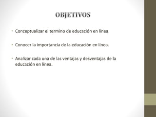 La educación en línea es una modalidad educativa que utiliza tecnologías de la información y comunicación para facilitar procesos de enseñanza y aprendizaje a distancia. Tiene ventajas como la flexibilidad y bajos costos, pero también desventajas como la pasividad de los estudiantes y dificultades técnicas. El documento analiza conceptos, ventajas, desventajas y el desarrollo histórico de la educación en línea.