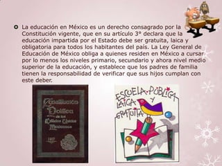 La educación en México es un derecho constitucional y obligatoria hasta el nivel medio superior. La Secretaría de Educación Pública administra los diferentes niveles educativos a nivel nacional y cada estado tiene su propia institución educativa. Existen desigualdades en el acceso y calidad de la educación entre zonas rurales/urbanas y entre escuelas públicas/privadas. UNICEF apoya a crear una educación inclusiva y de calidad para todos los niños, especialmente los más vulnerables.