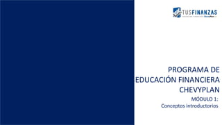 El programa de educación financiera de Chevyplan busca mejorar el comportamiento financiero de los clientes en Ecuador a través de un módulo introductorio sobre conceptos como planificación, ahorro y administración del crédito, que se ofrece sin costo. Se enfatiza la importancia de establecer metas financieras SMART y la regla 50/40/10 para la gestión de ingresos. Además, el programa incluye estrategias para maximizar el ahorro y mejorar la capacidad financiera para la compra de vehículos.