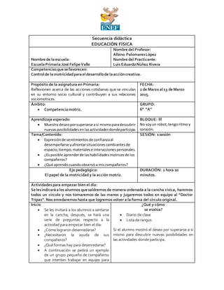 Este documento presenta una secuencia didáctica de educación física para el grupo 6° "A" con el objetivo de que los estudiantes expresen sentimientos de confianza al desempeñarse y afrontar situaciones cambiantes a través de actividades grupales y demostraciones de habilidades motrices individuales, así como aprendan de las habilidades de sus compañeros. La secuencia incluye actividades para desarrollar la cooperación en equipo, presentaciones individuales de habilidades y una coreografía grupal final para evaluar los objetivos.