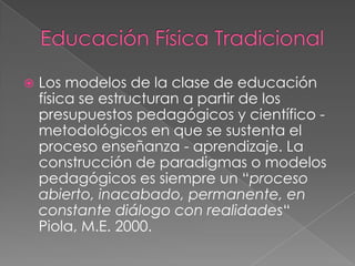 El documento discute los modelos de la clase de educación física, los cuales se estructuran a partir de presupuestos pedagógicos y científico-metodológicos que sustentan el proceso de enseñanza-aprendizaje. También menciona que la construcción de paradigmas o modelos pedagógicos es un proceso abierto y permanente en diálogo con realidades.