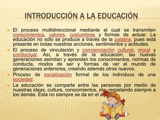 La educación es un proceso multidireccional de transmisión de conocimientos, valores y formas de actuar a través de la palabra y las acciones. Existen tres tipos de educación: formal, no formal e informal. La educación básica incluye la preescolar, primaria y secundaria y busca desarrollar habilidades básicas y disposiciones para el aprendizaje a lo largo de la vida.