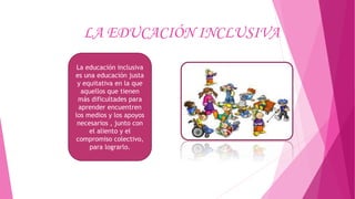 La educación inclusiva promueve la igualdad de oportunidades y una educación personalizada para todos los estudiantes, incluyendo a aquellos con más dificultades de aprendizaje. Los objetivos de la escuela inclusiva incluyen flexibilizar las estructuras educativas y fomentar la participación, solidaridad y cooperación entre estudiantes. La escuela inclusiva apuesta por la participación, el apoyo a estudiantes con dificultades y el respeto mutuo entre todos.