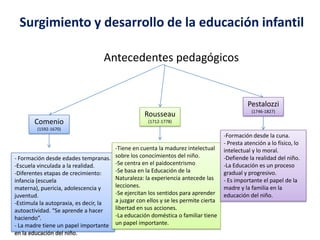 Este documento resume los antecedentes pedagógicos de Comenio, Rousseau y Pestalozzi, quienes defendieron la educación desde edades tempranas y el papel de la familia. Luego describe a Owen, Wilderspin y Montesino como pioneros de la educación infantil en el siglo XIX al crear las primeras instituciones para la formación del carácter de los niños. Finalmente, explica que la educación infantil tiene funciones de guardería, normalizadora e integradora y específicamente educativa, con finalidades como facilitar la escol