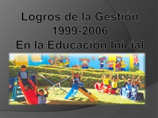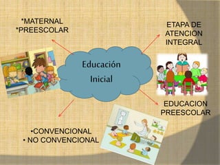 Este documento describe la etapa de atención integral de la educación preescolar en Venezuela. Explica que la educación inicial privilegia a la familia y busca el desarrollo pleno de los niños a través de experiencias significativas que fomenten valores como la identidad, convivencia, honestidad y justicia. También detalla los objetivos del currículo de educación inicial venezolano y los logros alcanzados, como la atención del 97% de niños de 3 a 6 años y el aumento previsto de la cobertura para menores de 3 años.