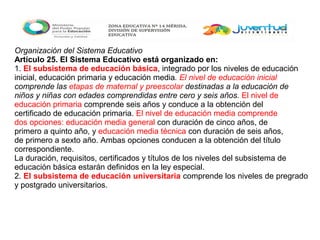 El documento detalla la estructura del sistema educativo en Venezuela, concentrándose en la educación inicial, que abarca a niños de 0 a 6 años mediante dos etapas: maternal y preescolar. Se enfatiza la importancia de un ambiente de aprendizaje integral que fomente el desarrollo integral, la participación activa de la familia, y la inclusión de niños en situaciones de riesgo. Además, se delinean objetivos educativos orientados a construir una convivencia saludable y respetuosa, así como la planificación y evaluación de actividades pedagógicas.