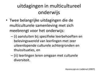 Este documento describe la educación intercultural en Holanda. Resume que (1) Holanda tiene una sociedad multicultural debido a la inmigración, con más del 19% de la población teniendo orígenes no occidentales. (2) El sistema educativo holandés enfrenta desafíos para conectar con los estudiantes de diversos orígenes culturales y enseñarles a lidiar con la diversidad. (3) Se han implementado varias políticas y programas para promover la integración cultural y el respeto entre los estudiantes de diferentes trasfond
