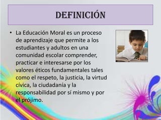 Este documento define la educación moral como un proceso de aprendizaje que permite a los estudiantes y adultos comprender y practicar valores como el respeto, la justicia y la responsabilidad. Explica que la educación moral se ha convertido en uno de los pilares de la educación y forma ciudadanos autónomos conscientes de sus deberes y derechos. Finalmente, concluye que la educación debe formar las capacidades de autorregulación para lograr un acuerdo entre el juicio y la acción y construir progresivamente la personalidad.