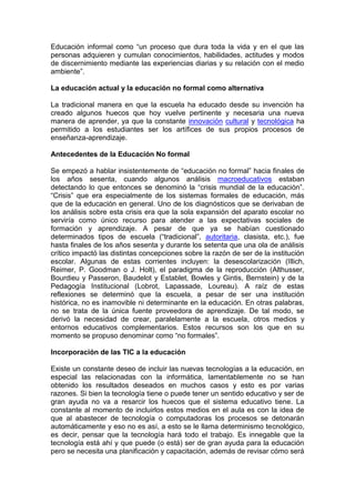 La educación no formal se refiere a la educación que tiene lugar fuera del sistema educativo formal y convencional. Se caracteriza por ser más flexible en cuanto a espacio y tiempo, permitiendo la educación a distancia y a lo largo de la vida. A diferencia de la educación formal, no sigue una secuencia estricta y permite el aprendizaje constante. El documento también discute la necesidad de desarrollar nuevas competencias y alfabetizaciones para hacer uso de la tecnología en la sociedad de la información.