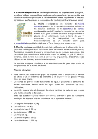 Este documento trata sobre la importancia de un consumo responsable y sostenible. Explica conceptos como consumo responsable, huella ecológica y mochila ecológica. Resalta la necesidad de considerar el impacto ambiental de los productos a lo largo de todo su ciclo de vida y promueve alternativas de consumo más sustentables como optar por lo local, rechazar bolsas plásticas y preferir envases retornables. Además, propone criterios para que los consumidores elijan productos de acuerdo a sus
